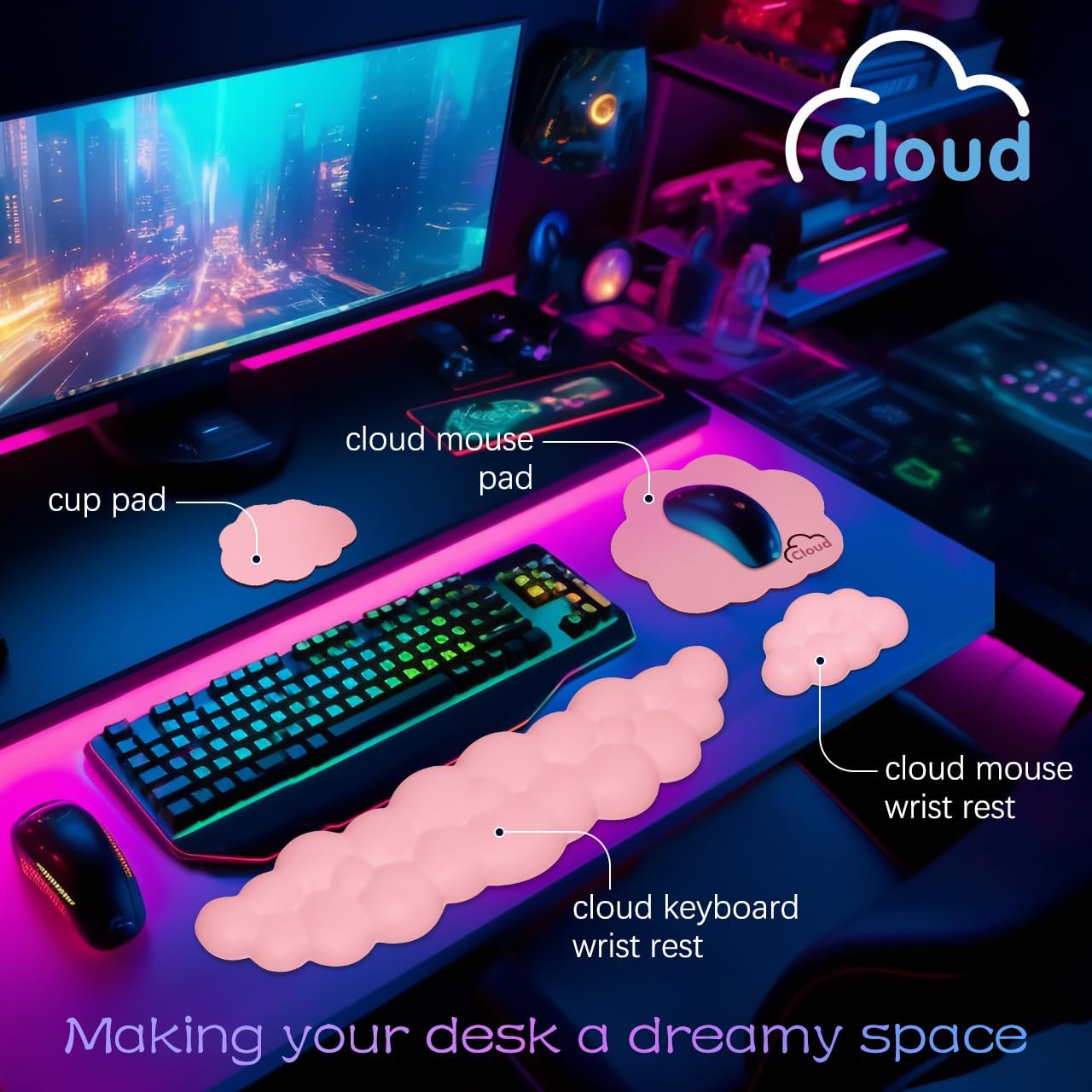 【4-In-1 Cloud Computer Accessories】This stylish gift box includes a cloud keyboard wrist, a cup pad and a cute mouse pad with wrist, and available in five stylish colors for your choice, the waterproof leather covering that is not only durable but also easy to clean