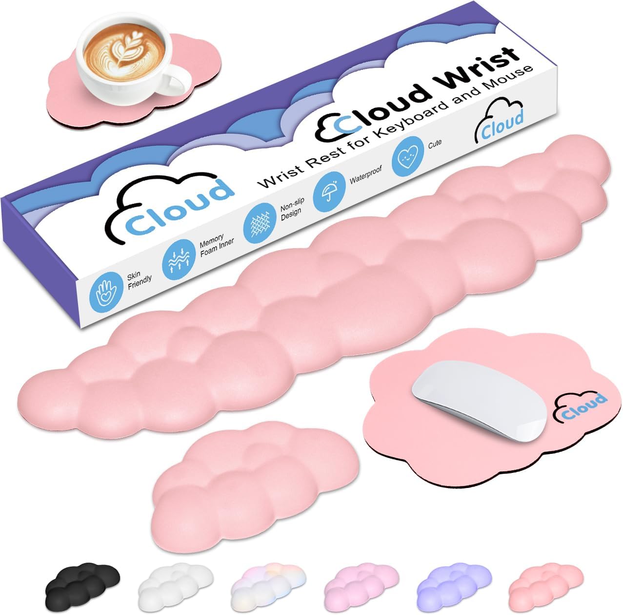 【4-In-1 Cloud Computer Accessories】This stylish gift box includes a cloud keyboard wrist, a cup pad and a cute mouse pad with wrist, and available in five stylish colors for your choice, the waterproof leather covering that is not only durable but also easy to clean