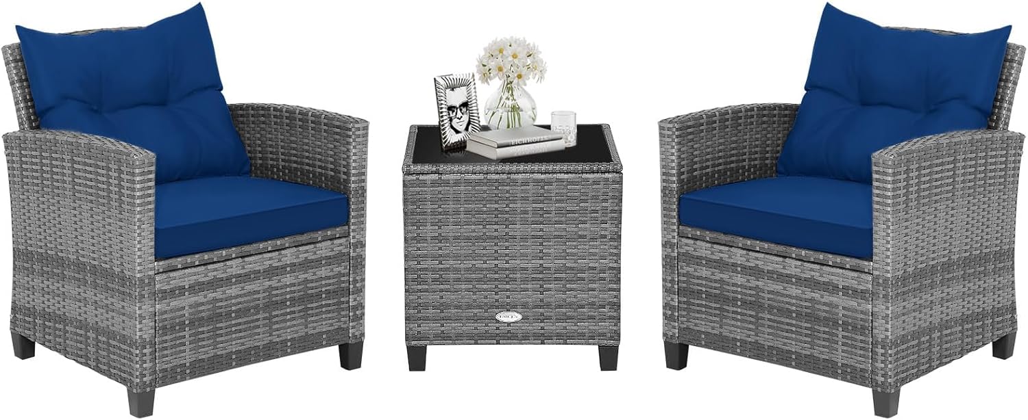 【Excellent Stability & Durability】 This 3 pieces patio furniture set is made of sun-resistant mix gray PE rattan for longer outdoor service. Besides, the heavy-duty metal structure with rustproof surface features excellent sturdiness and durability. And the stable foot pad ensures extra support.